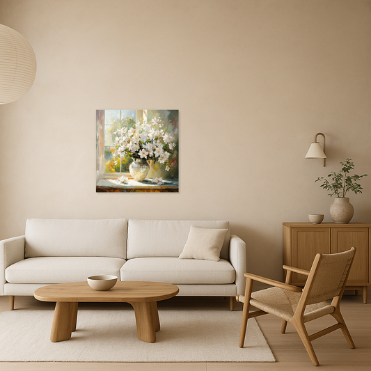 Bloemen in zonlicht bij het raam