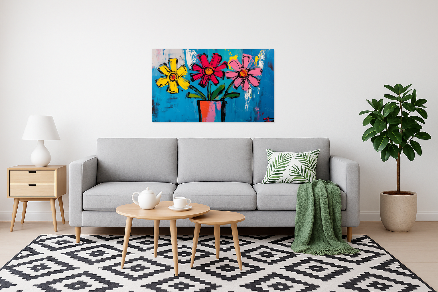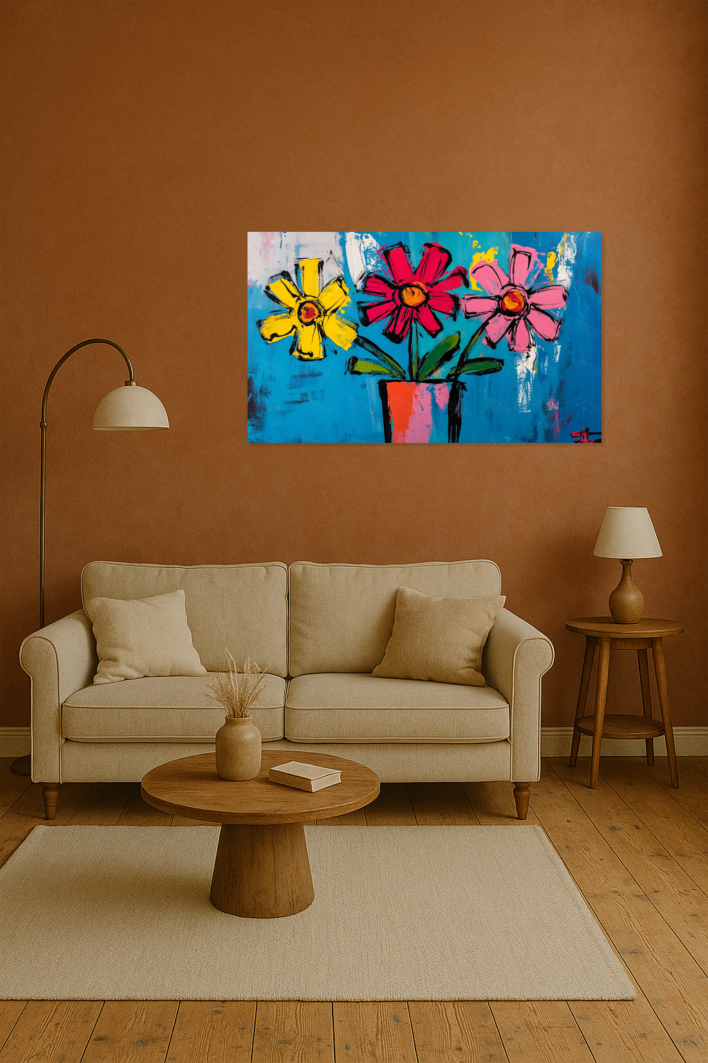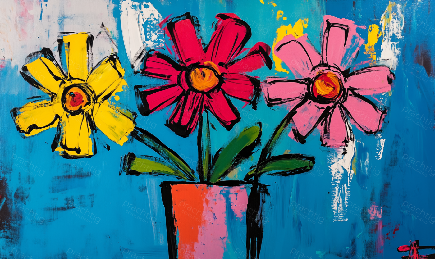 Laat je betoveren door deze vrolijke bloemencompositie. Op dit kleurrijke schilderij ontdek je drie uitbundige bloemen in een moderne, expressieve stijl. De felle kleuren roze, rood en geel contrasteren prachtig tegen een levendige blauwe achtergrond. De dikke zwarte lijnen geven de bloemstelen en blaadjes een speels karakter. Deze kunstdruk brengt energie en kleur in jouw woonkamer, kantoor of slaapkamer. Een echte blikvanger voor liefhebbers van moderne kunst.