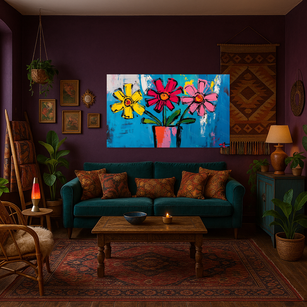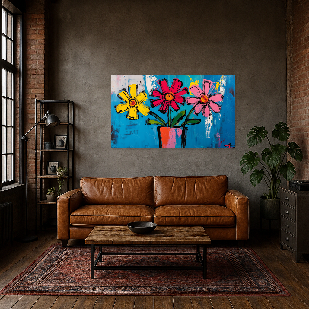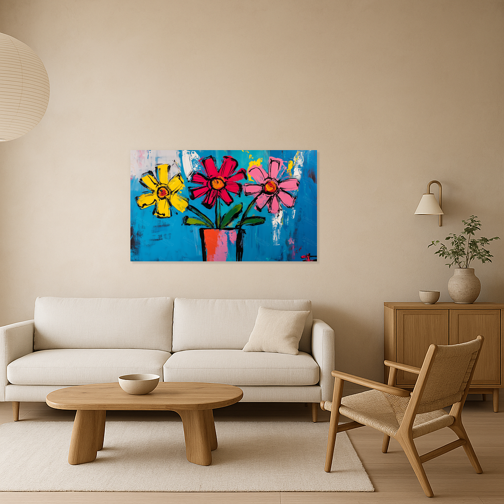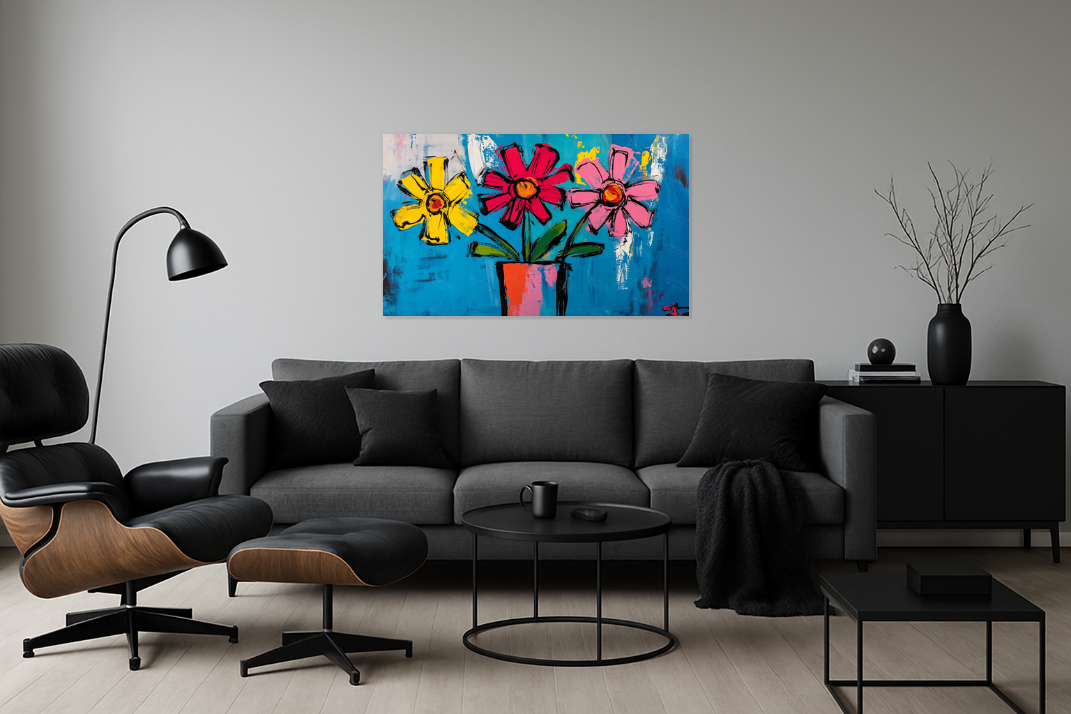 Laat je betoveren door deze vrolijke bloemencompositie. Op dit kleurrijke schilderij ontdek je drie uitbundige bloemen in een moderne, expressieve stijl. De felle kleuren roze, rood en geel contrasteren prachtig tegen een levendige blauwe achtergrond. De dikke zwarte lijnen geven de bloemstelen en blaadjes een speels karakter. Deze kunstdruk brengt energie en kleur in jouw woonkamer, kantoor of slaapkamer. Een echte blikvanger voor liefhebbers van moderne kunst.
