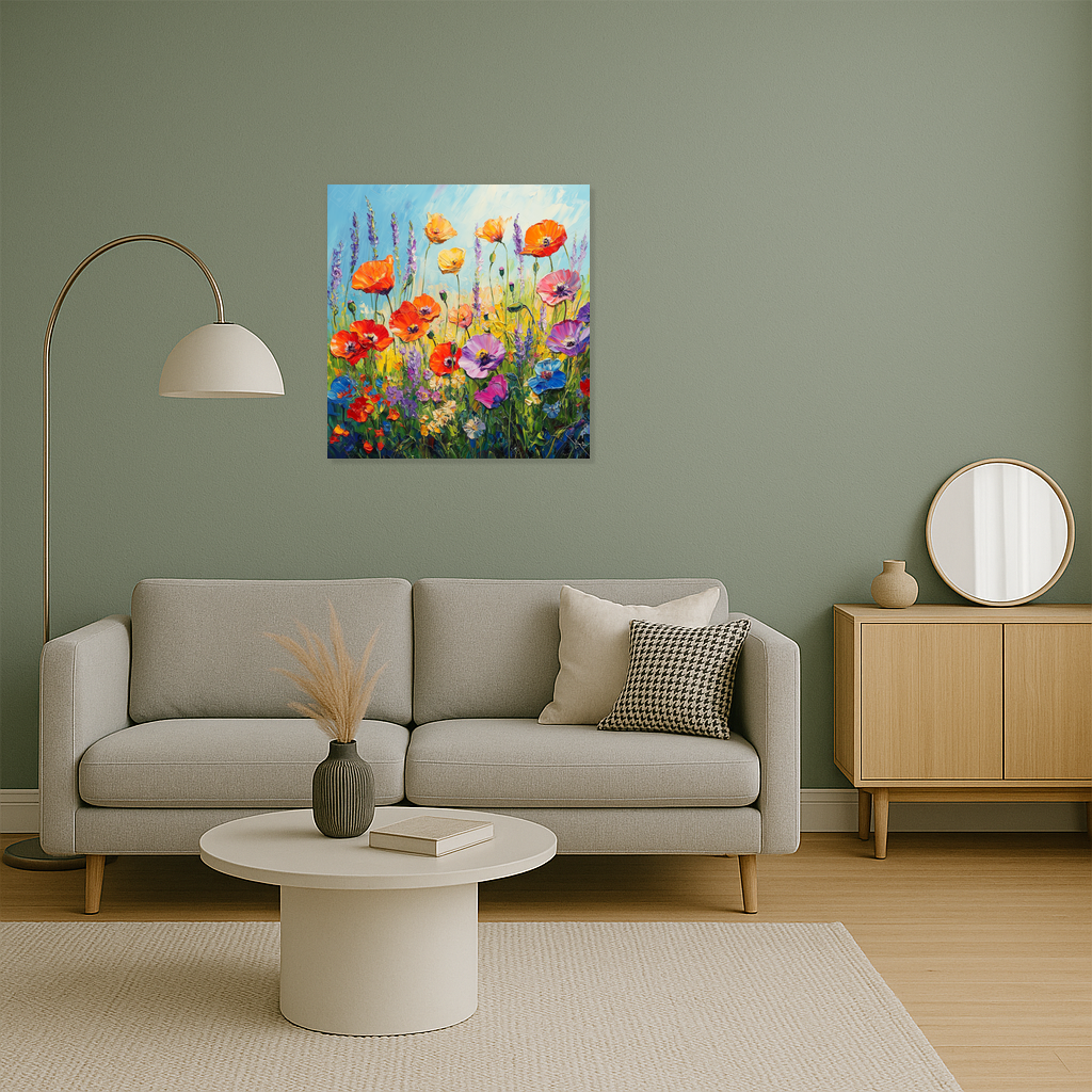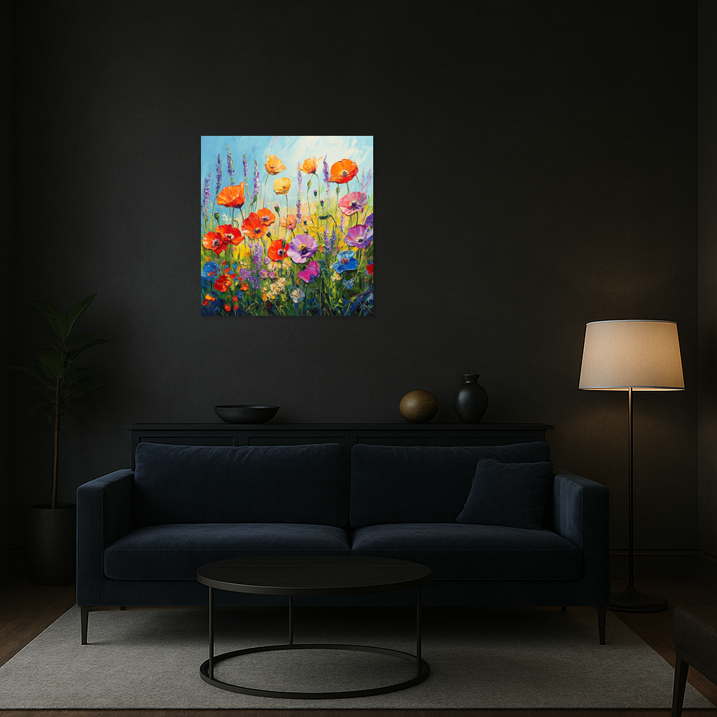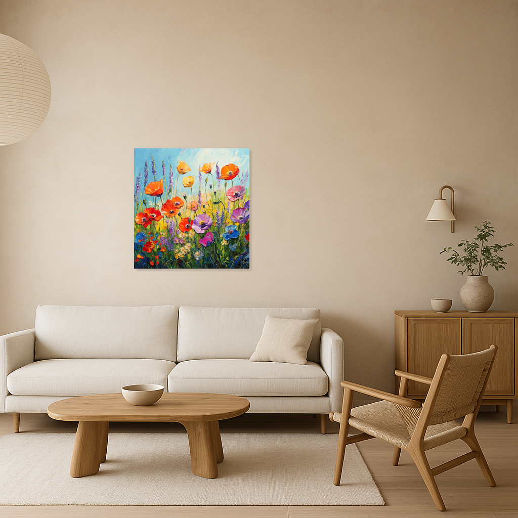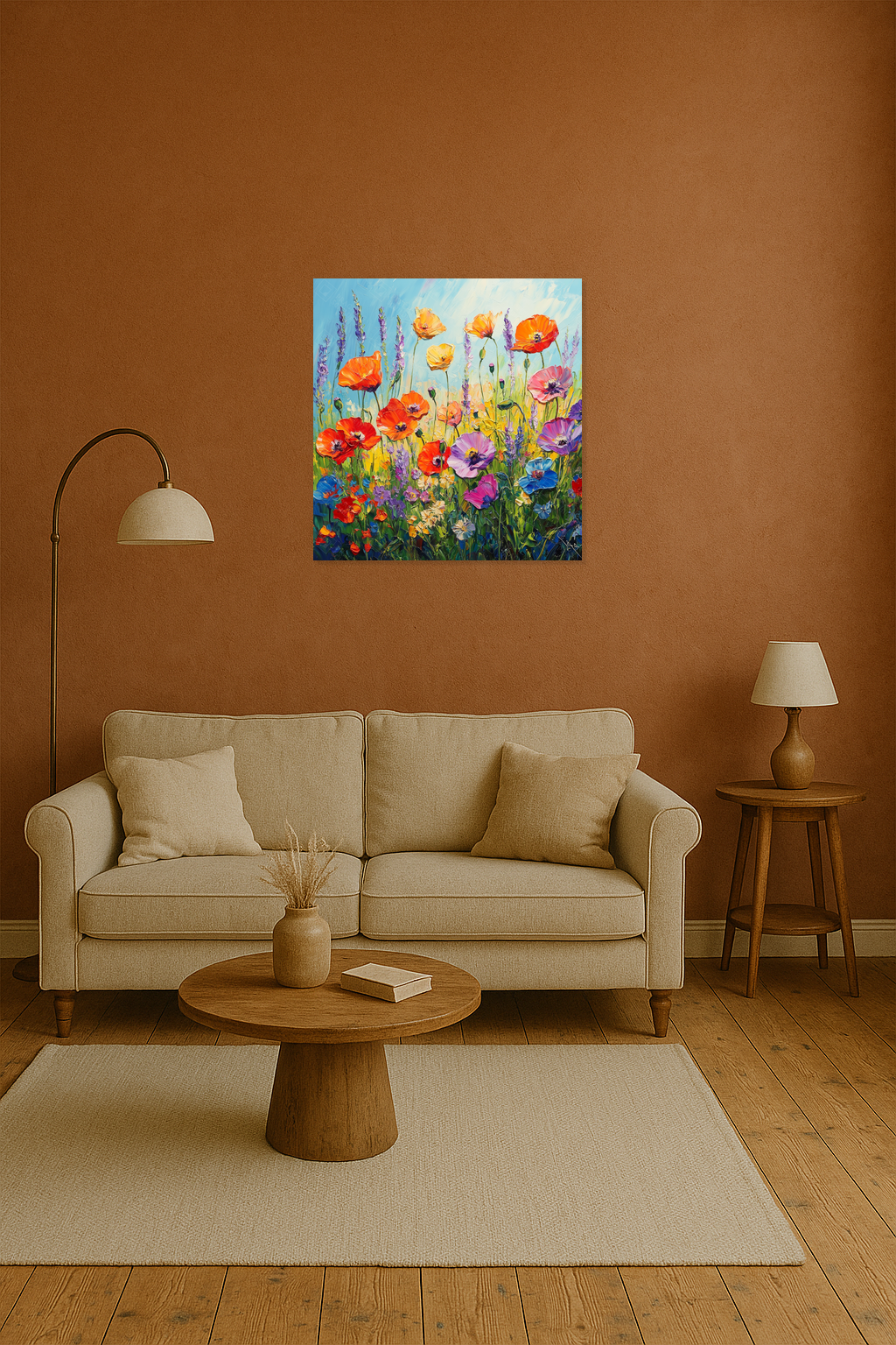Verlang je naar een vleugje natuur in huis? Dit schilderij brengt een weelderige bloemenzee je woonkamer in. De kleuren springen van het doek: feloranje klaprozen mengen zich met zachte paarse bloesems, gevangen in een spel van zon en schaduw.