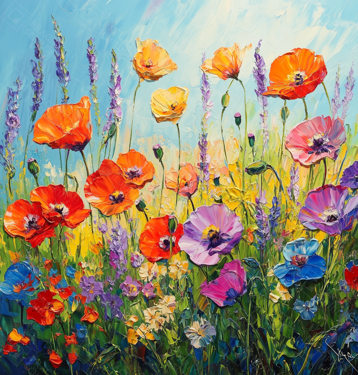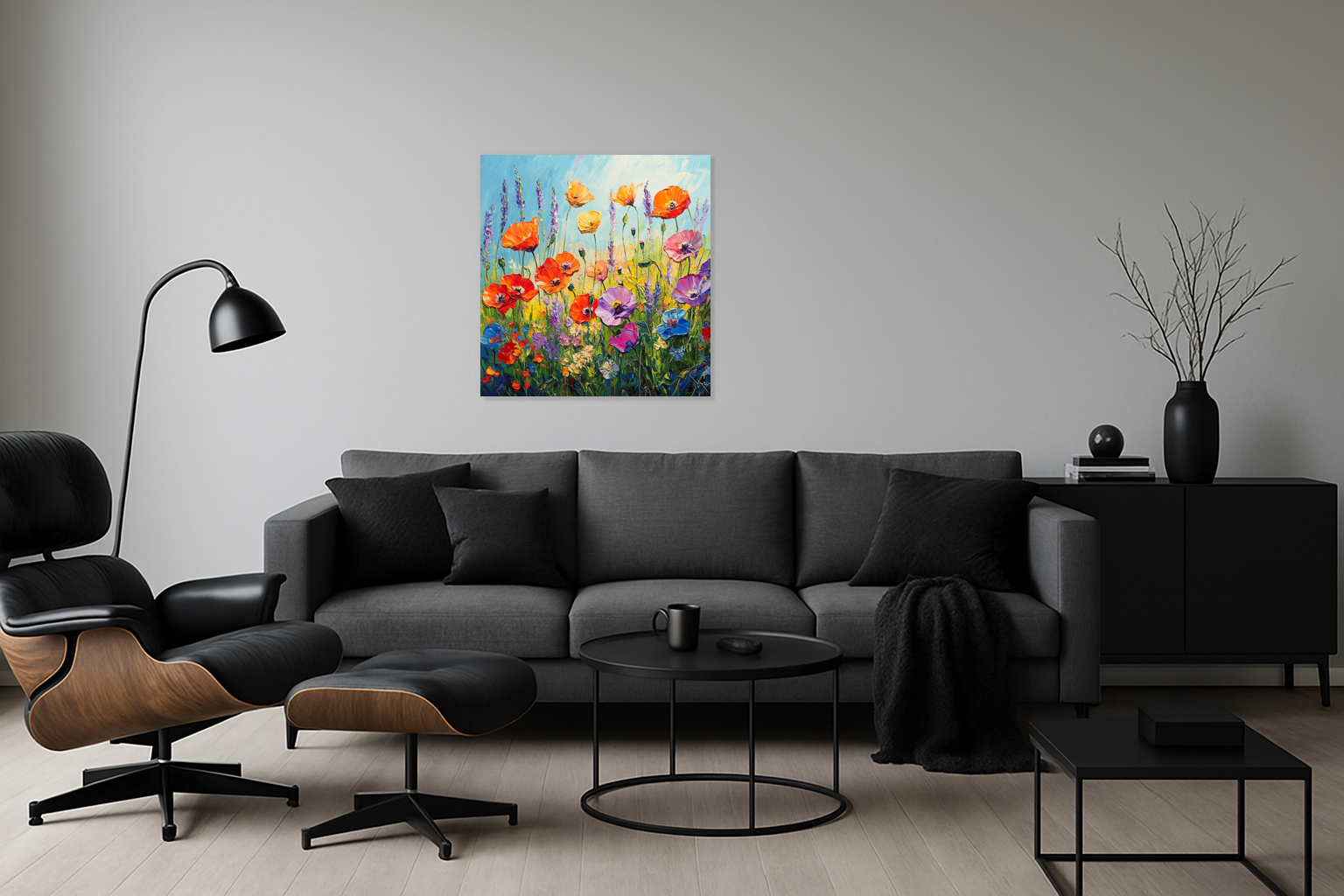 Je voelt de zomerwind als je blik over het doek glijdt. De dikke penseelstreken geven het werk een tastbare textuur, alsof je de bloemblaadjes bijna kunt aanraken. Vormen en lijnen vloeien samen tot een harmonieuze dans die elke ruimte opfleurt.