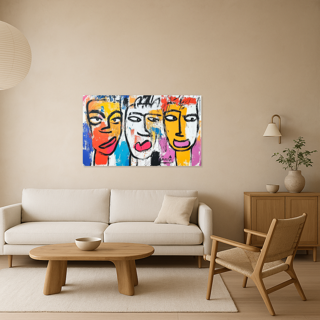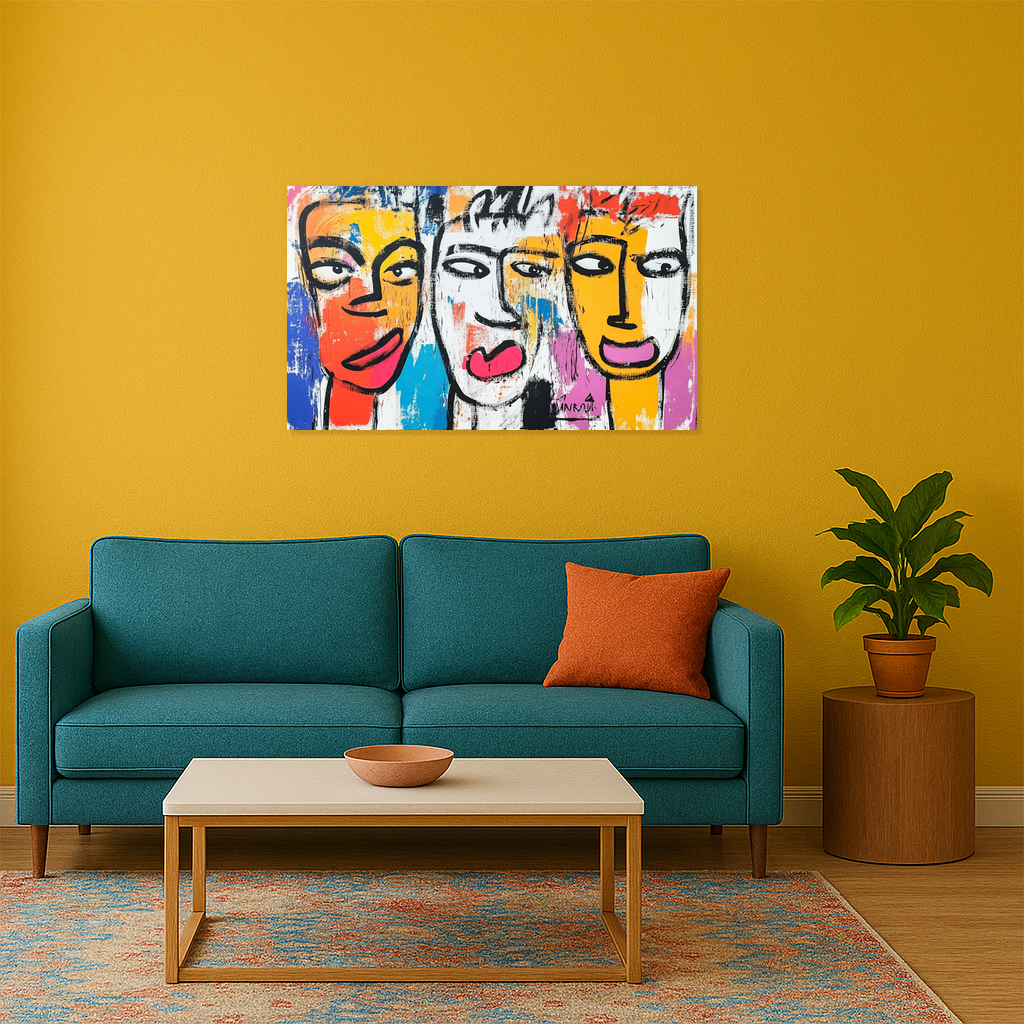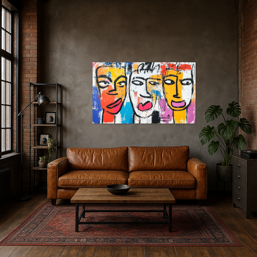 Dit kunstwerk barst van energie en kleur. Drie expressieve gezichten staren je aan, direct maar met een speelse twist. De felle tinten rood, geel en blauw komen tot leven. Ze contrasteren prachtig met de dikke zwarte lijnen. Het gebruik van heldere vlakken en ruige penseelstreken geeft diepte en levendigheid aan het schilderij. Deze moderne stijl trekt direct de aandacht. Hang het in jouw woonkamer of kantoor voor een frisse, creatieve sfeer. Dit schilderij trekt gegarandeerd de aandacht en stimuleert de verbeelding.