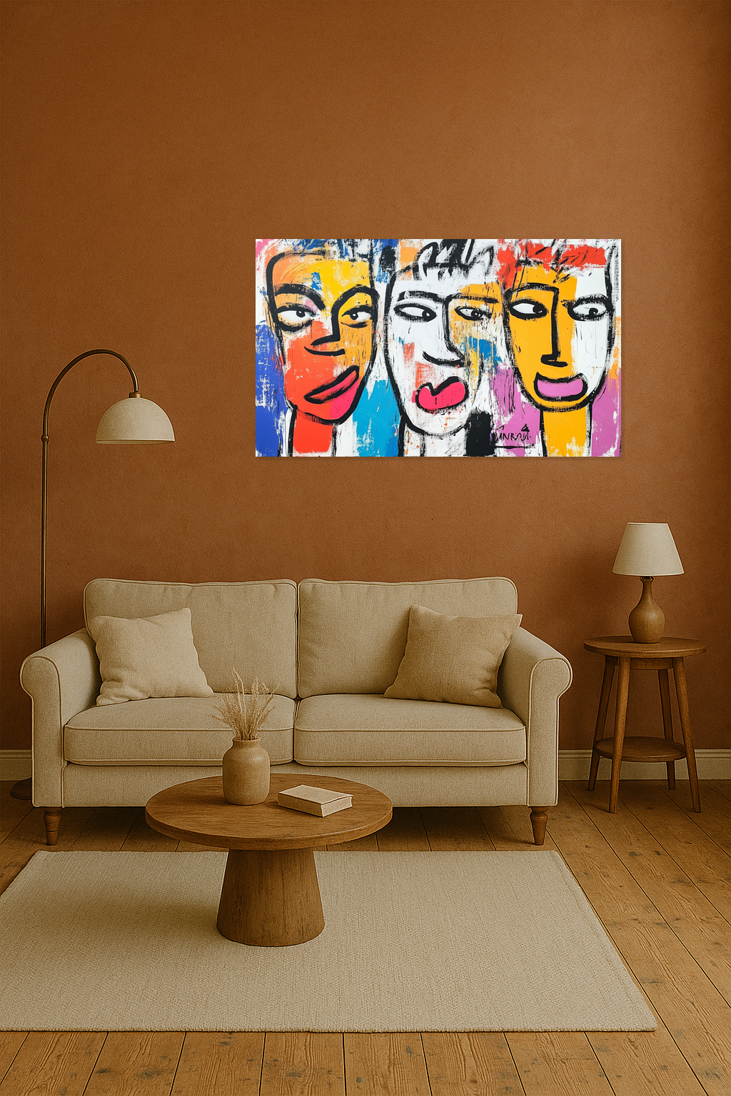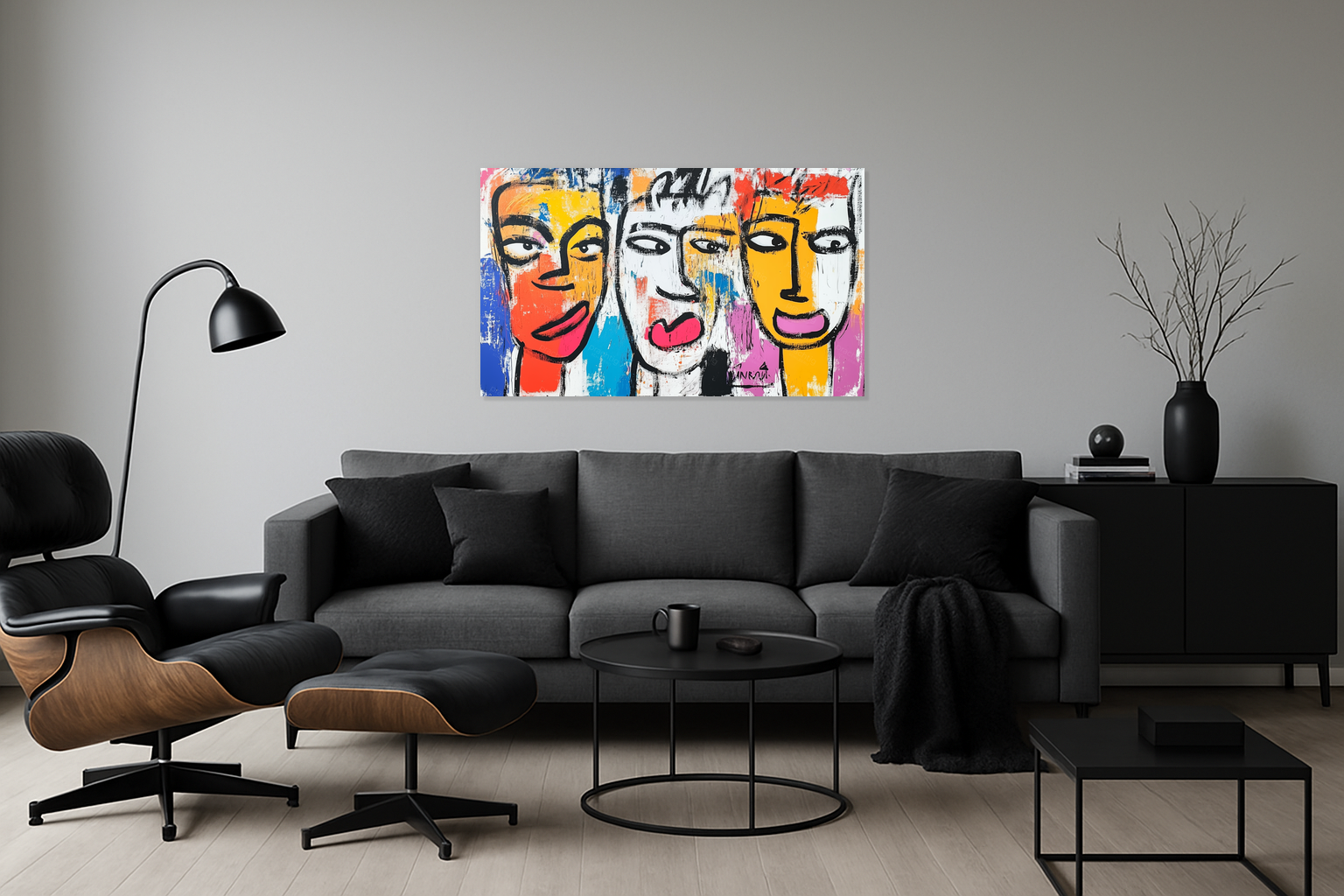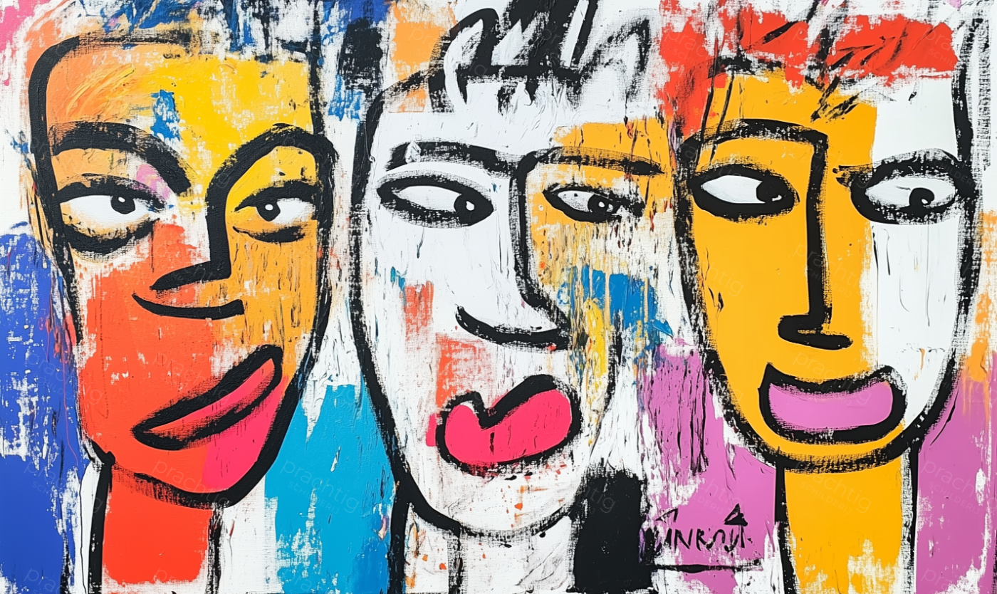 Dit kunstwerk barst van energie en kleur. Drie expressieve gezichten staren je aan, direct maar met een speelse twist. De felle tinten rood, geel en blauw komen tot leven. Ze contrasteren prachtig met de dikke zwarte lijnen. Het gebruik van heldere vlakken en ruige penseelstreken geeft diepte en levendigheid aan het schilderij. Deze moderne stijl trekt direct de aandacht. Hang het in jouw woonkamer of kantoor voor een frisse, creatieve sfeer. Dit schilderij trekt gegarandeerd de aandacht en stimuleert de verbeelding.