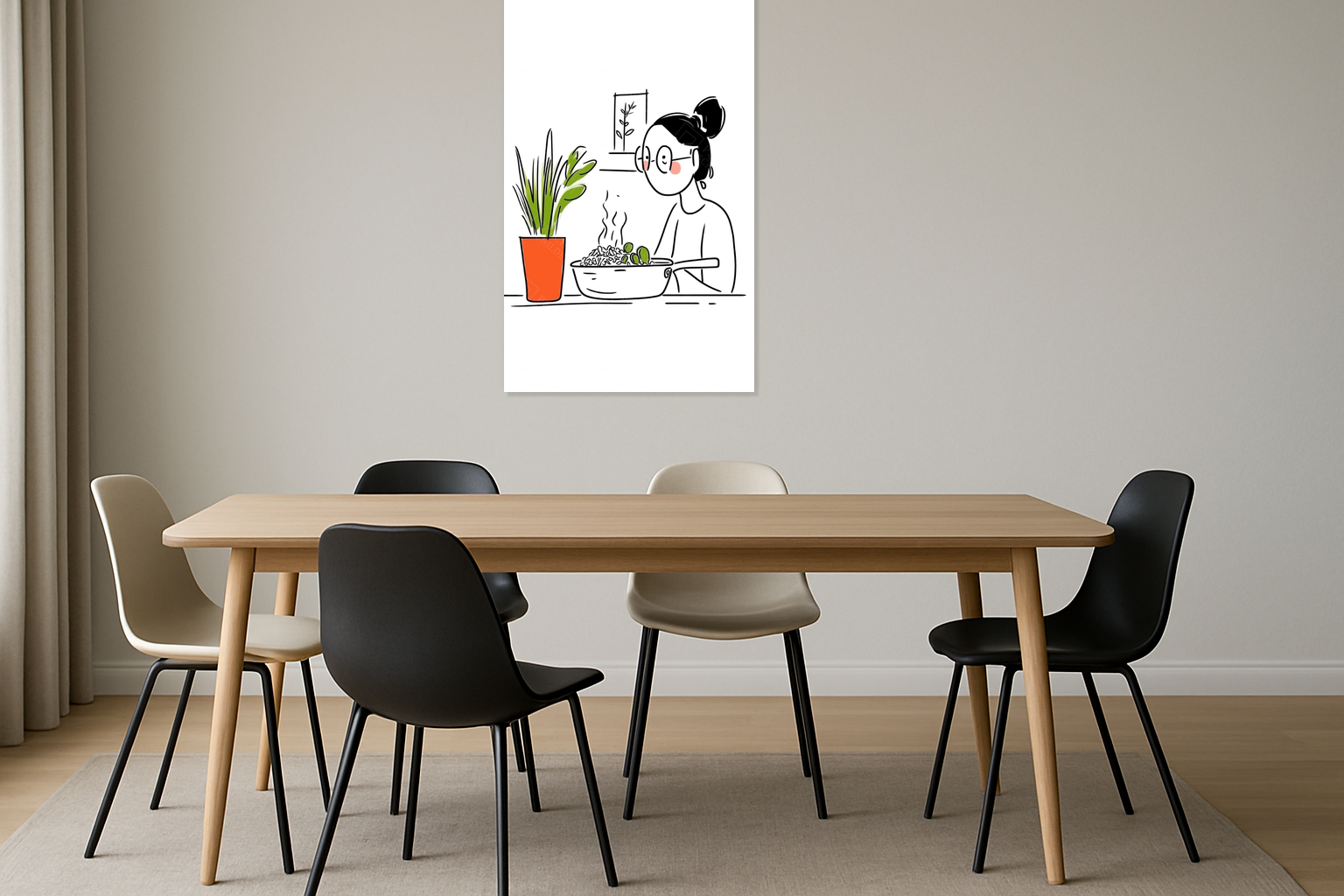 De zachte lijnen en sprekende details vormen samen een rustige compositie. Het simpele kleurgebruik maakt het werk zowel uitnodigend als veelzijdig. Het past perfect bij een moderne keuken of eetkamer, waar het de ruimte een zachte, persoonlijke touch geeft.