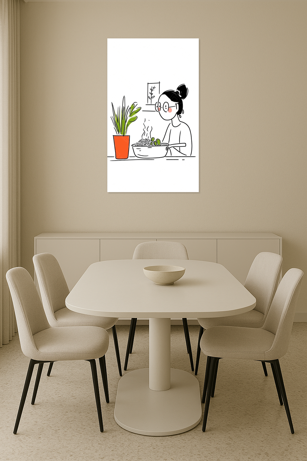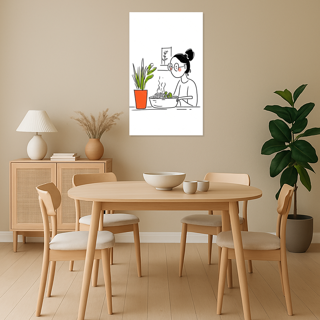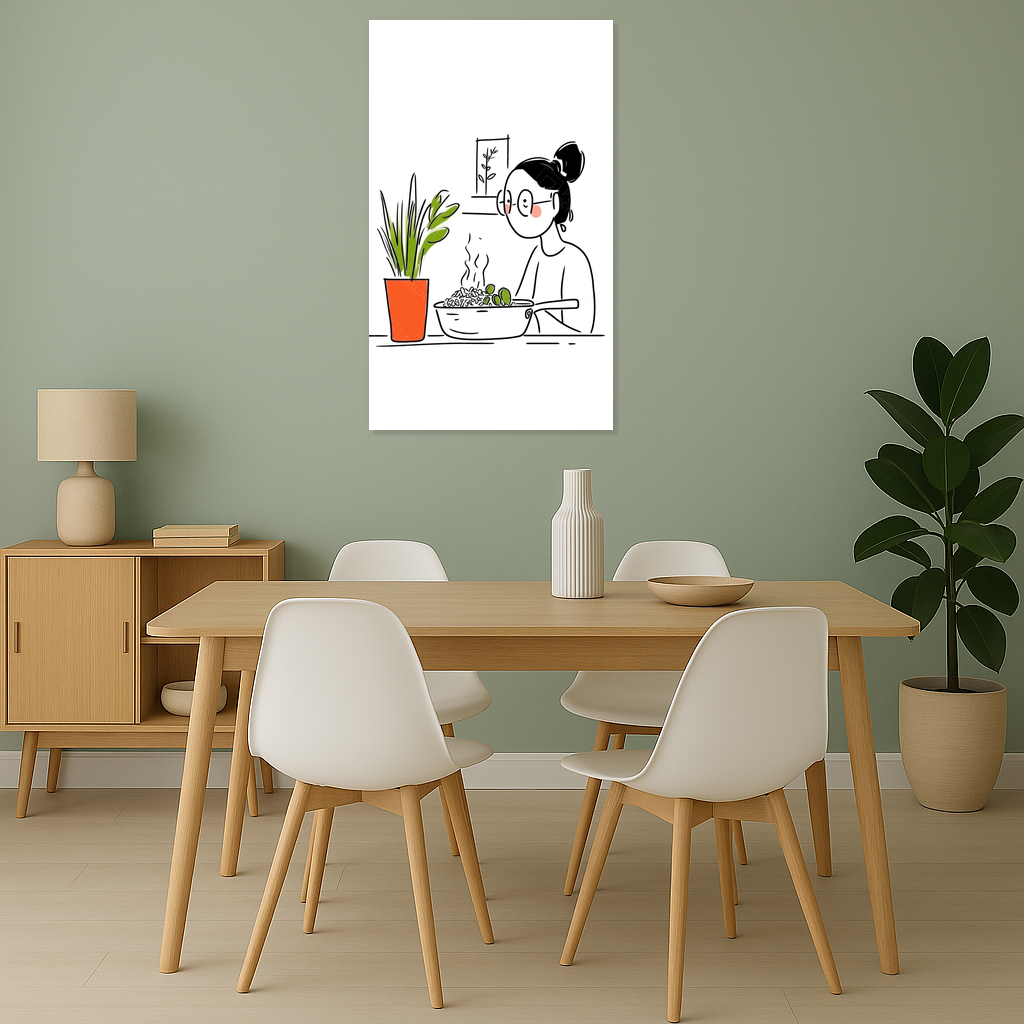 Voel je de warmte van thuis? Deze illustratie vangt het alledaagse moment van koken met een fijne eenvoud. De frisse groene plant en het dampende gerecht ademen huiselijkheid. Dit is kunst die spreekt zonder te schreeuwen, subtiel en vol sfeer.