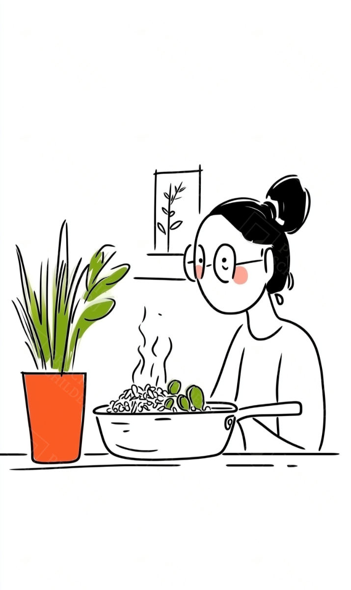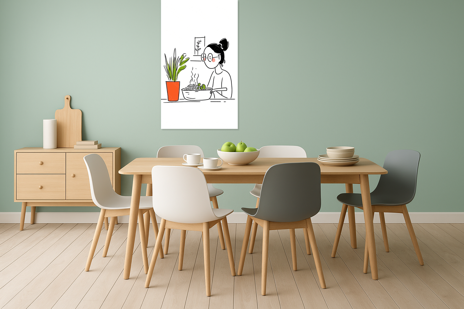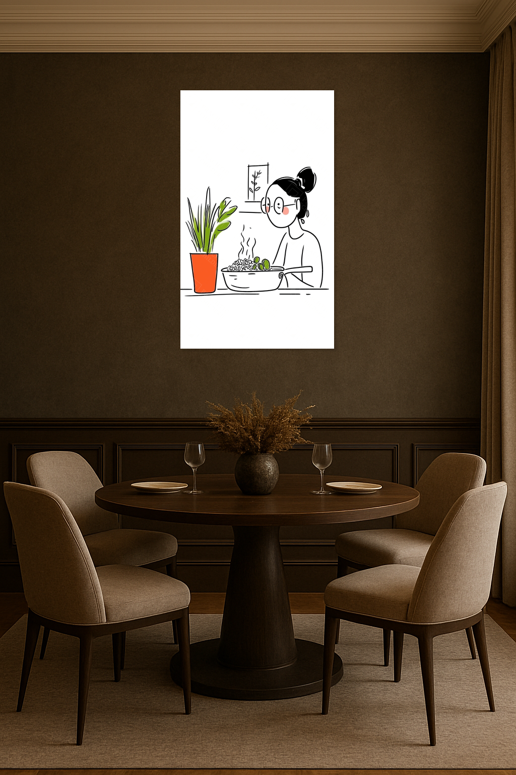 Voel je de warmte van thuis? Deze illustratie vangt het alledaagse moment van koken met een fijne eenvoud. De frisse groene plant en het dampende gerecht ademen huiselijkheid. Dit is kunst die spreekt zonder te schreeuwen, subtiel en vol sfeer.