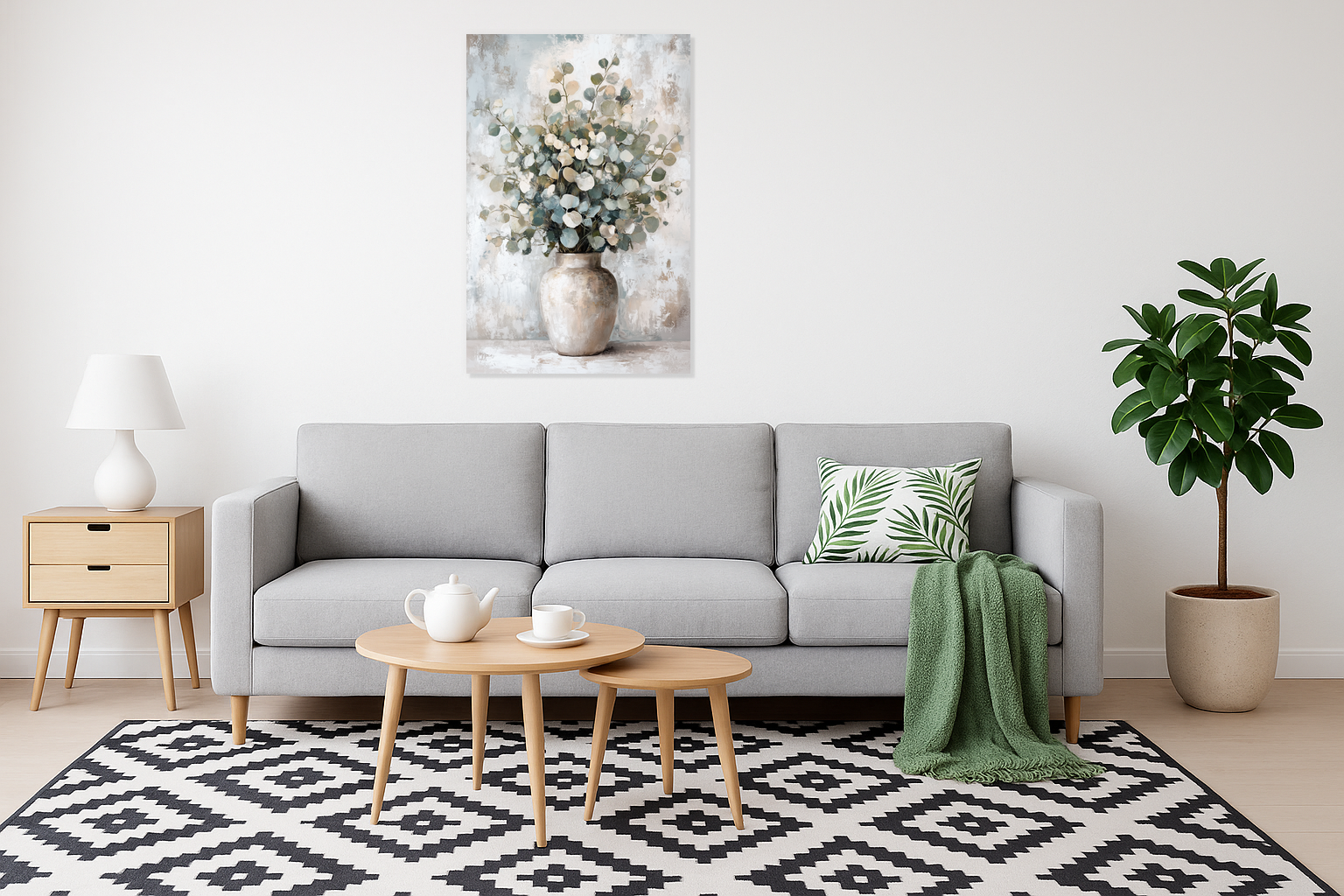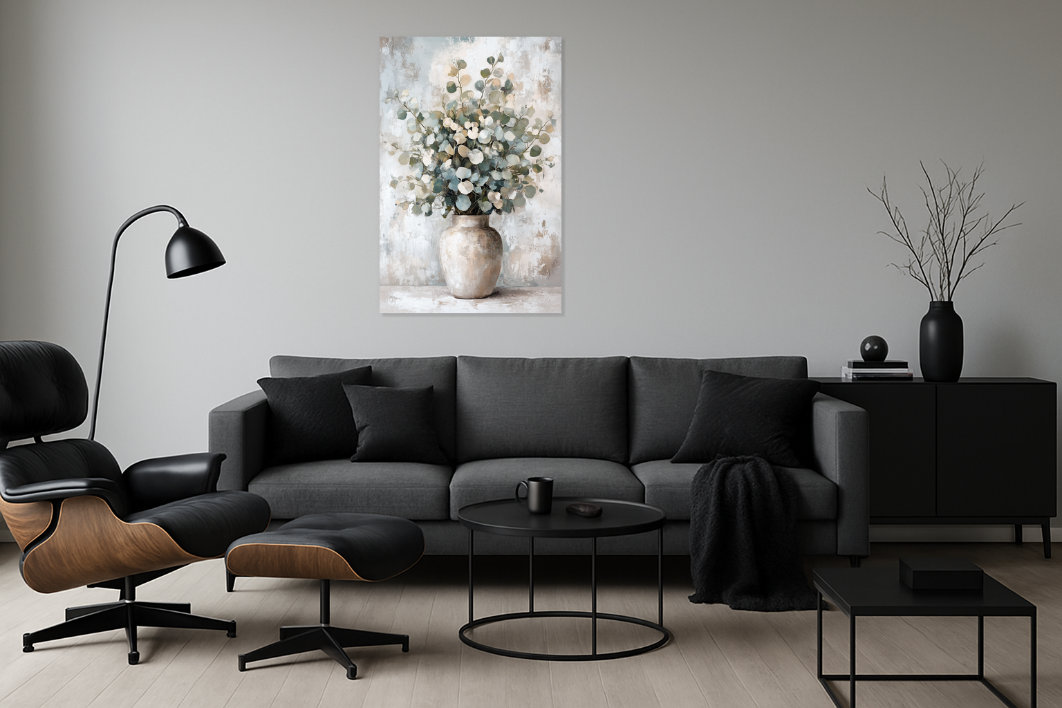 Ervaar de rust van eucalyptus in een rustieke vaas. De zachte, grijsgroene bladeren steken subtiel af tegen een lichte achtergrond. Strakke penseelstreken geven de bladeren diepte en textuur. De neutrale tinten brengen kalmte in je kamer. Het samenspel van licht en schaduw zorgt voor een serene sfeer. Dit werk past prachtig in een klassiek of modern interieur. Laat de eenvoud van de natuur je ruimte verfrissen.