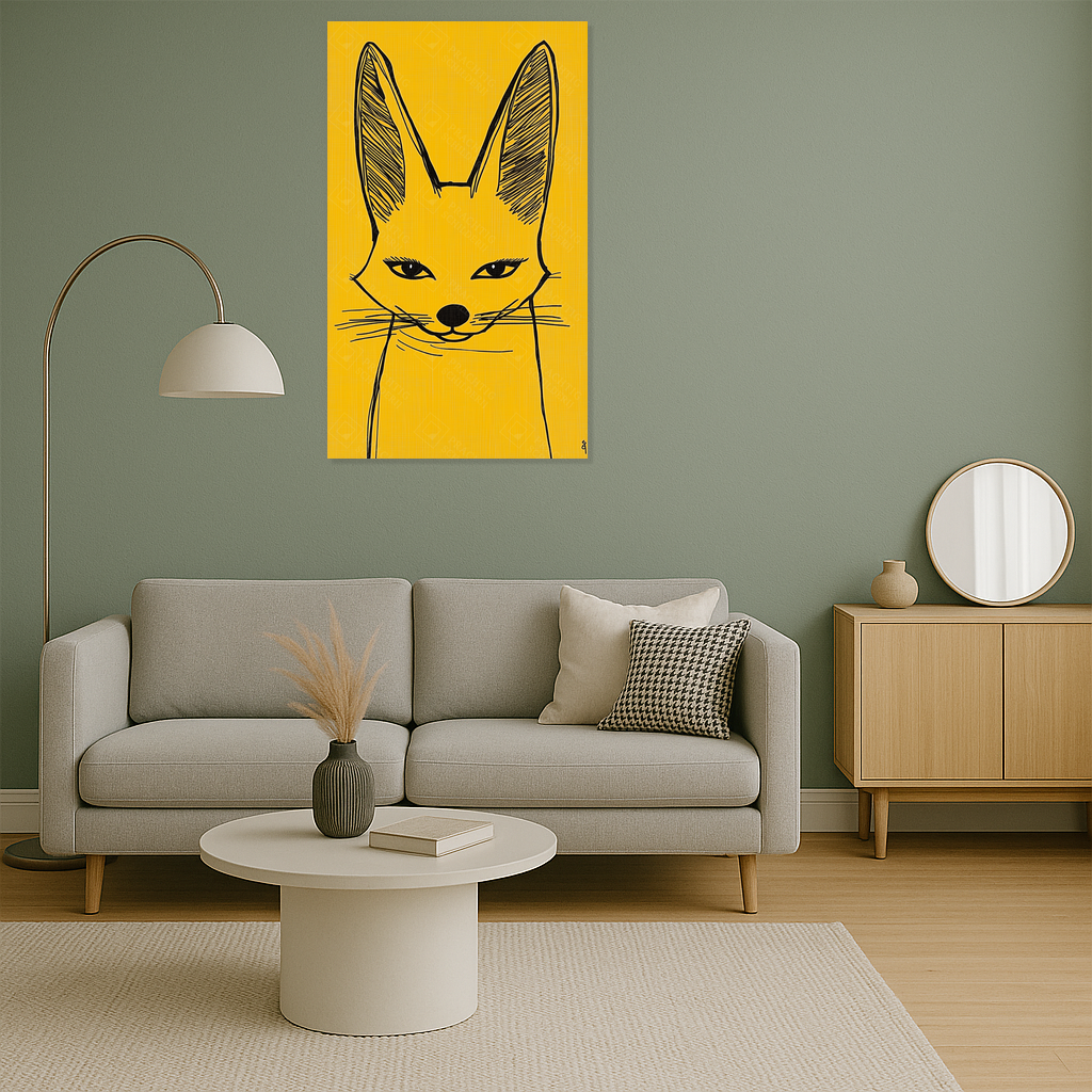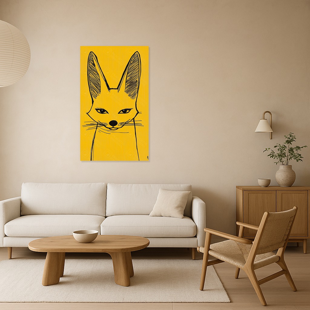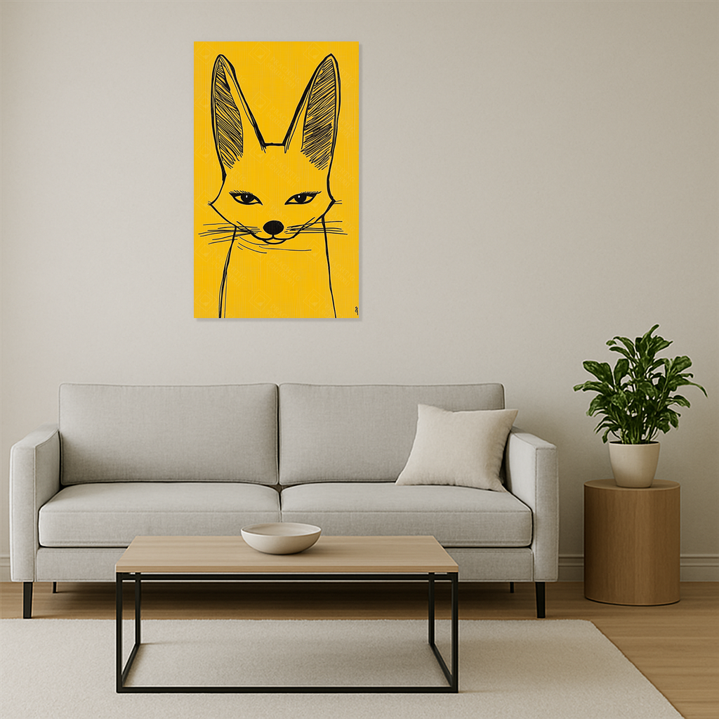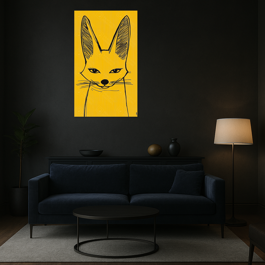 Heb je zin in een speelse knipoog aan je muur? Dit schilderij met een zwarte voslijn op een warme gele achtergrond laat je ruimte stralen. De scherpe oren en intense ogen trekken je aandacht, terwijl de eenvoudige lijnen een charmante eenvoud uitstralen.