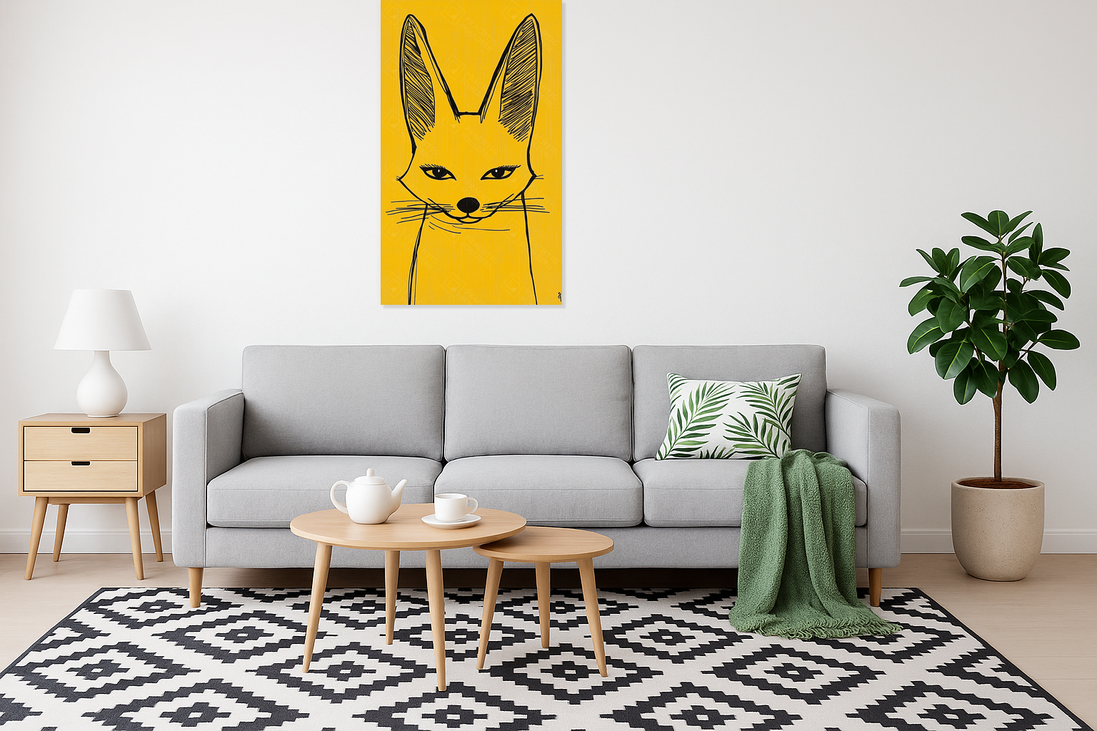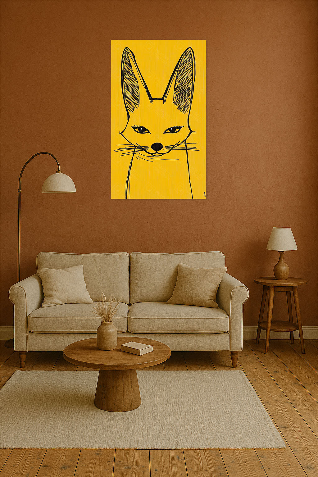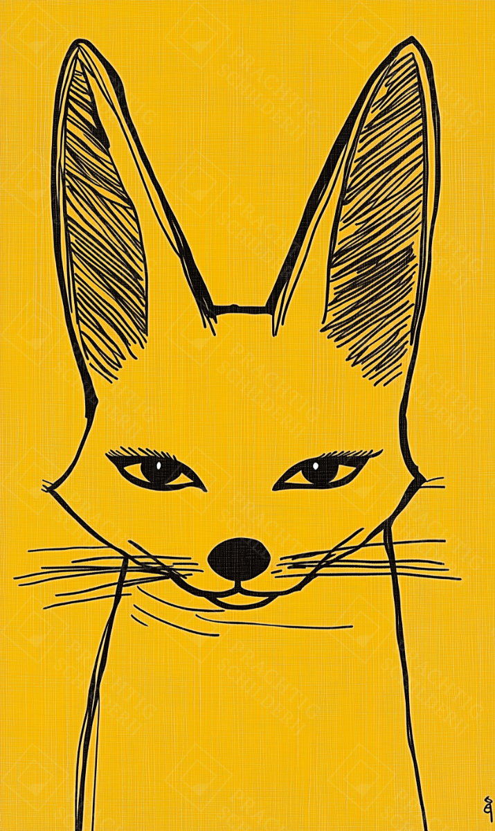 Heb je zin in een speelse knipoog aan je muur? Dit schilderij met een zwarte voslijn op een warme gele achtergrond laat je ruimte stralen. De scherpe oren en intense ogen trekken je aandacht, terwijl de eenvoudige lijnen een charmante eenvoud uitstralen.