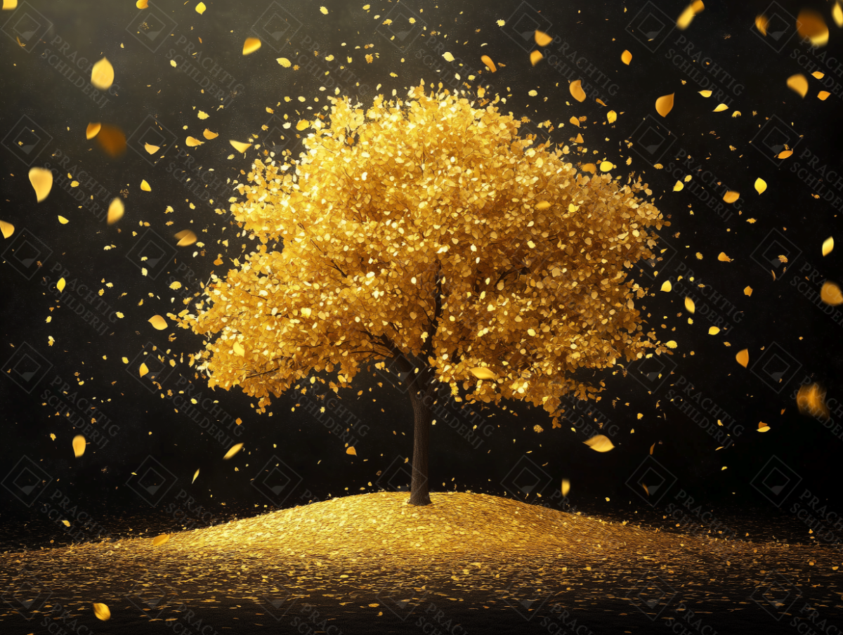 Voel de warmte van de herfst met dit schilderij vol gouden bladeren. De boom staat stevig in het midden, omgeven door een zee van vallend blad. Elk blaadje vangt het licht, alsof ze dansen in een zachte bries.