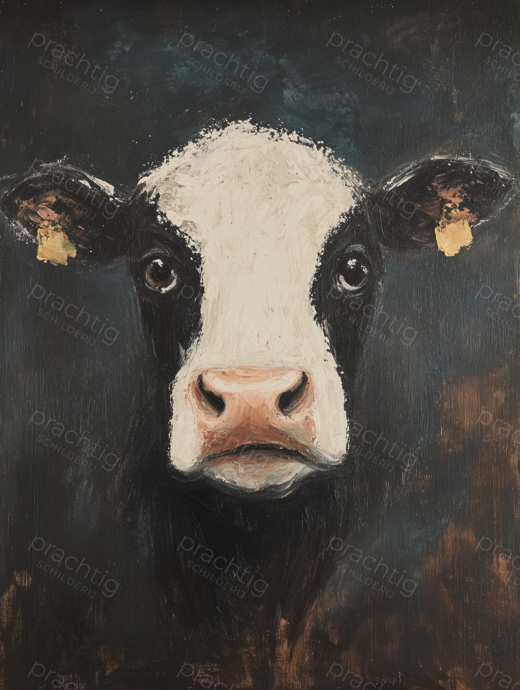 Dit schilderij toont een intrigerend portret van een koe tegen een donkere achtergrond. De koe kijkt direct naar de kijker, met grote, expressieve ogen die nieuwsgierigheid opwekken. De combinatie van zwart-witte tinten met subtiele bruine en beige accenten zorgt voor een sterk contrast. Je ziet de olieverftechniek duidelijk, vooral in de textuur van de vacht en de diepte van de schaduwen. Het geeft een realistisch en bijna tastbare uitstraling. De eenvoudige maar krachtige compositie maakt dit schilderij geschikt voor diverse ruimtes, van een moderne woonkamer tot een gezellige boerderijkeuken.