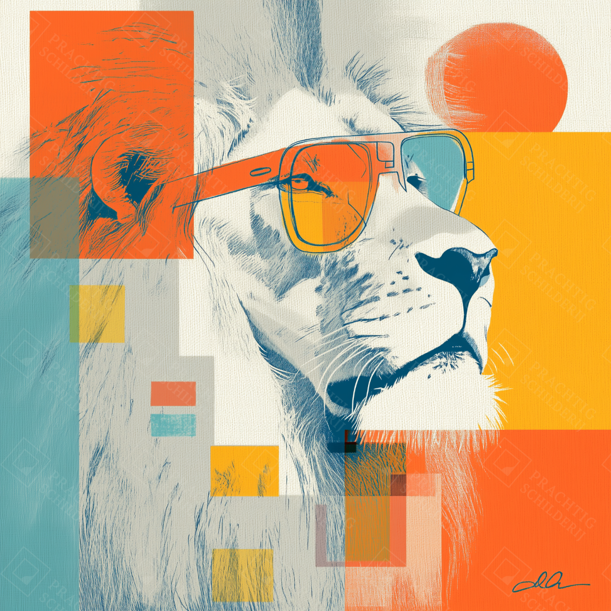Wil je je interieur een speelse draai geven? Deze moderne leeuw met zonnebril springt in het oog met zijn opvallende kleurvlakken. Oranje en geel stralen, met blauwe accenten die alles in balans brengen. Het is alsof de leeuw je ruimte een knipoog geeft.