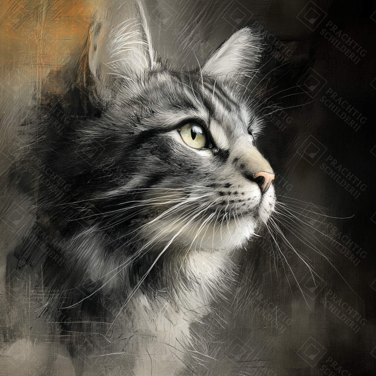 Zin in iets bijzonders aan de muur? Het portret van deze kat vangt de blik en nodigt je uit om even stil te staan. De subtiele penseelstreken maken de vacht bijna tastbaar, terwijl de ogen een verhaal vertellen van nieuwsgierigheid en kalmte.