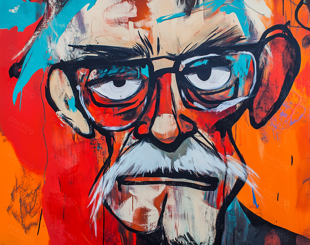 Een gedurfde en expressieve afbeelding trekt je aandacht. Een oudere man kijkt met een intense blik in de ogen. Het portret is vol van levendige kleuren en krachtige lijnen. De oranje en rode tinten domineren het achtergrondvlak, terwijl blauw accenten geven aan het haar en de bril. Het geeft een dynamische sfeer. De stijl doet denken aan de abstracte expressie, met een rauwe en directe schildertechniek. De penseelstreken zijn energiek en zichtbaar. Dit werk kan goed in een moderne woonkamer of creatieve werkruimte hangen. Het brengt direct leven in de ruimte en zorgt voor een gespreksonderwerp.