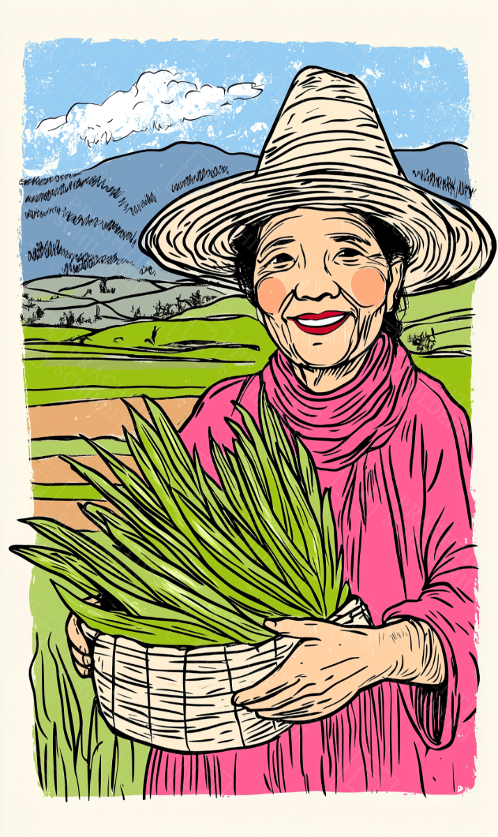 Zie je de sprankeling in de lucht? Dit schilderij vangt de levendigheid van een dag op het platteland. De dame straalt met haar mand vol groen, omringd door uitgestrekte velden en bergen in de verte. Het roze van haar kleding voegt warmte toe aan het geheel.