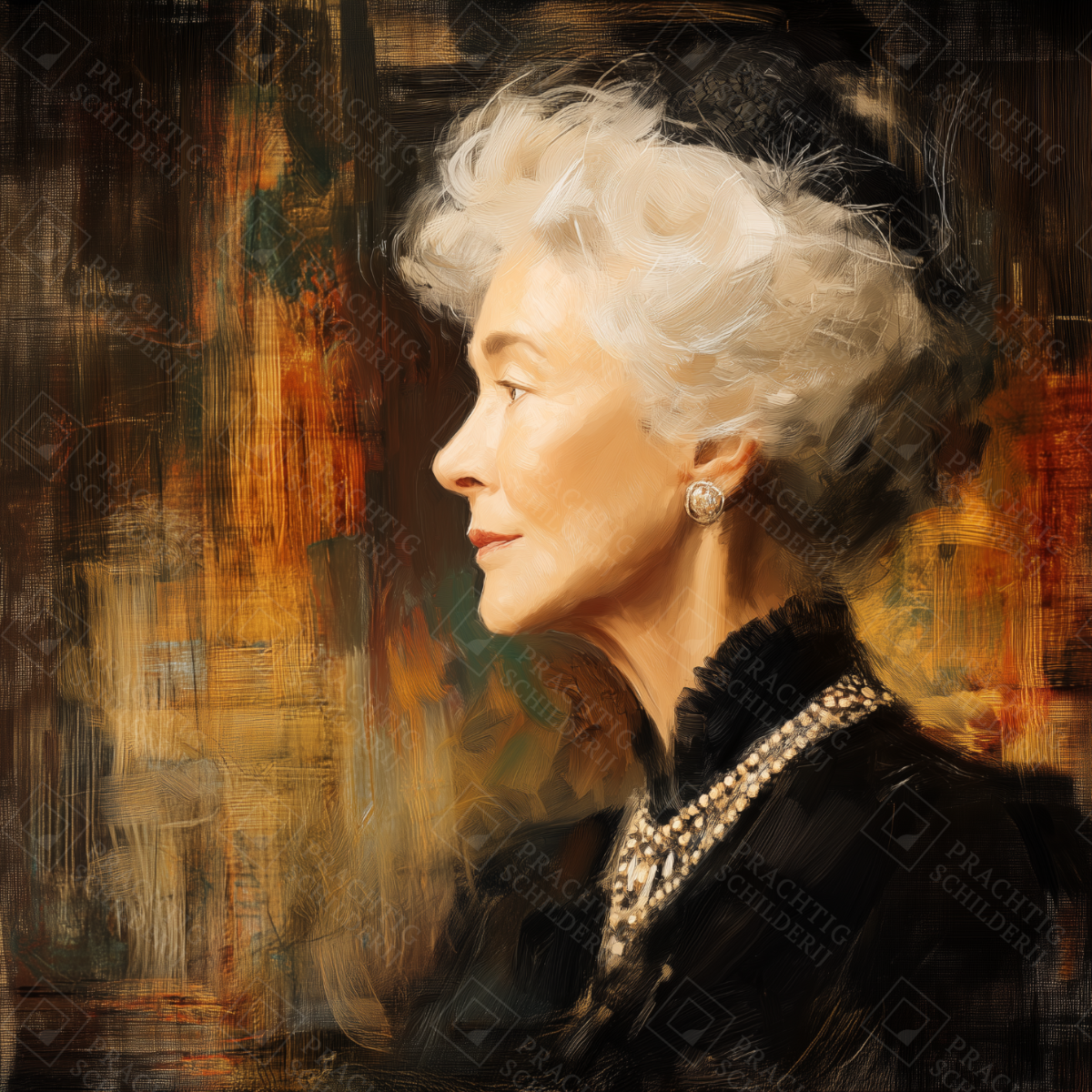 Haar zilveren haar en subtiele glimlach vertellen een verhaal zonder woorden. De penseelstreken zijn vloeiend en krachtig, waardoor iedere lijn en schaduw tot leven komt. Het is alsof je haar adem kunt voelen, zo levendig is het portret.