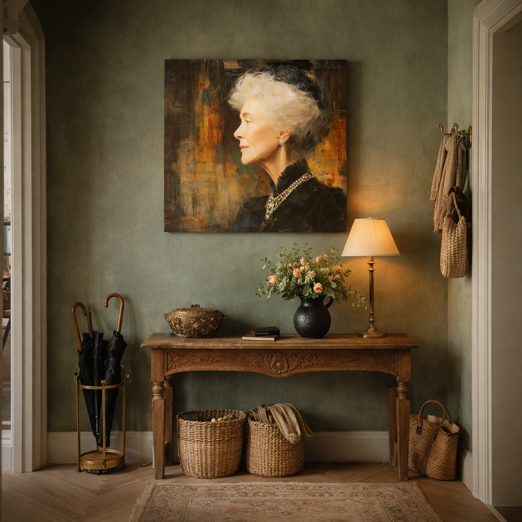 Voel de warmte en tijdloze elegantie van dit portret. Je ziet een vrouw, gevangen in een moment van rust en reflectie, met een zachte uitstraling die spreekt van levenservaring. De achtergrond is een spel van warme tinten die het geheel een rijke diepte geven. Hierdoor krijgt je muur een verhaal dat zowel rust als energie uitstraalt.